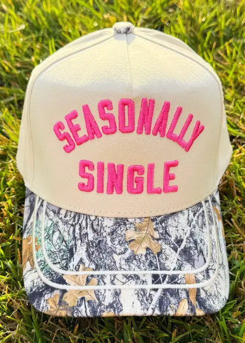 Top off your look with the Seasonally Single Camo Hat, a playful blend of style and humor.