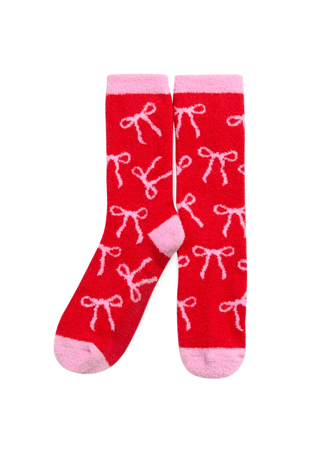 Wrap your feet in cuteness with the Bow Socks, the ultimate cozy accessory for your lounging lineup. Featuring an all-over pink bow print against a festive red background, these socks bring the perfect pop of charm to your winter wardrobe. The contrast heel, toe, and cuff add a playful touch while keeping things comfy and snug. Made from ultra-soft material, they’re as fun to wear as they are to gift.