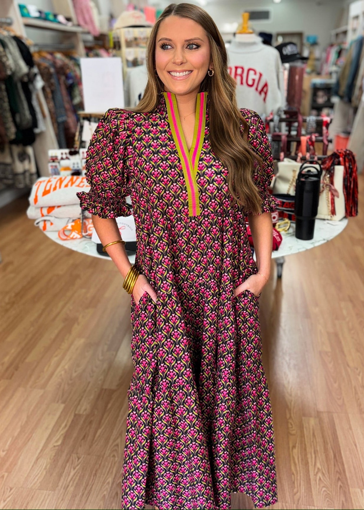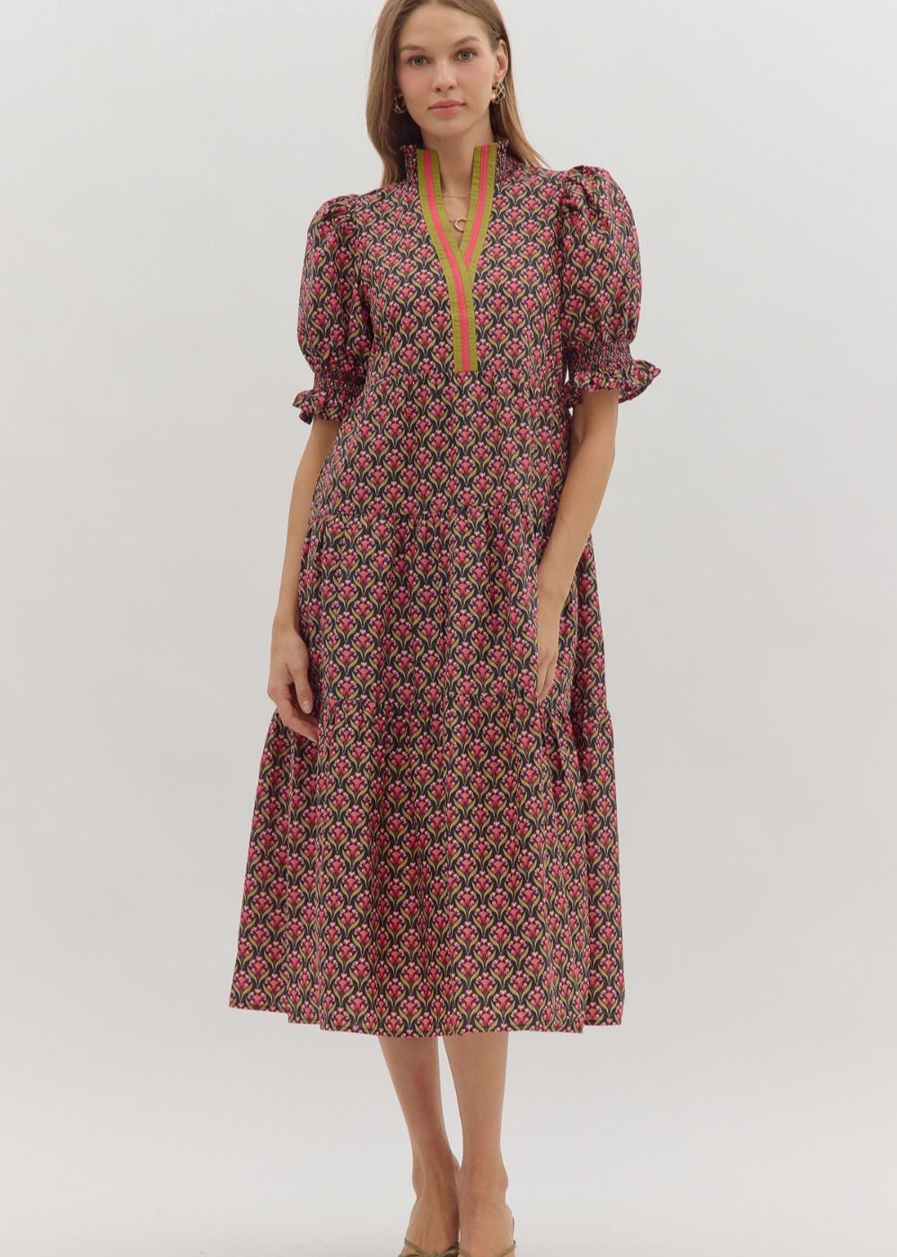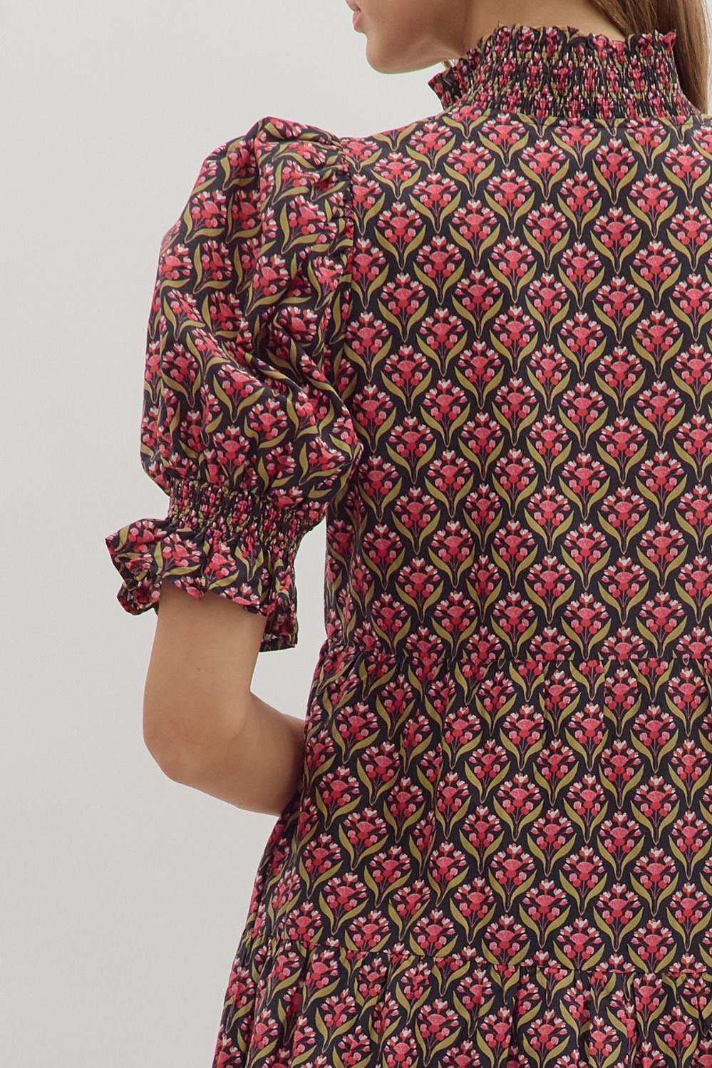 Bordeaux Nights Botanical Print Midi Dress - Black