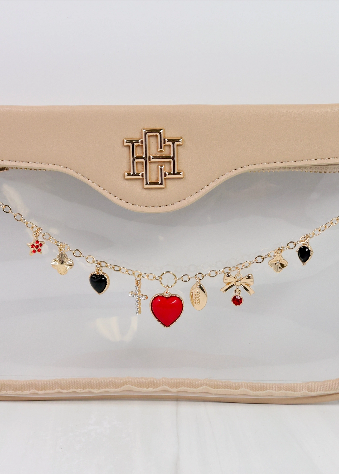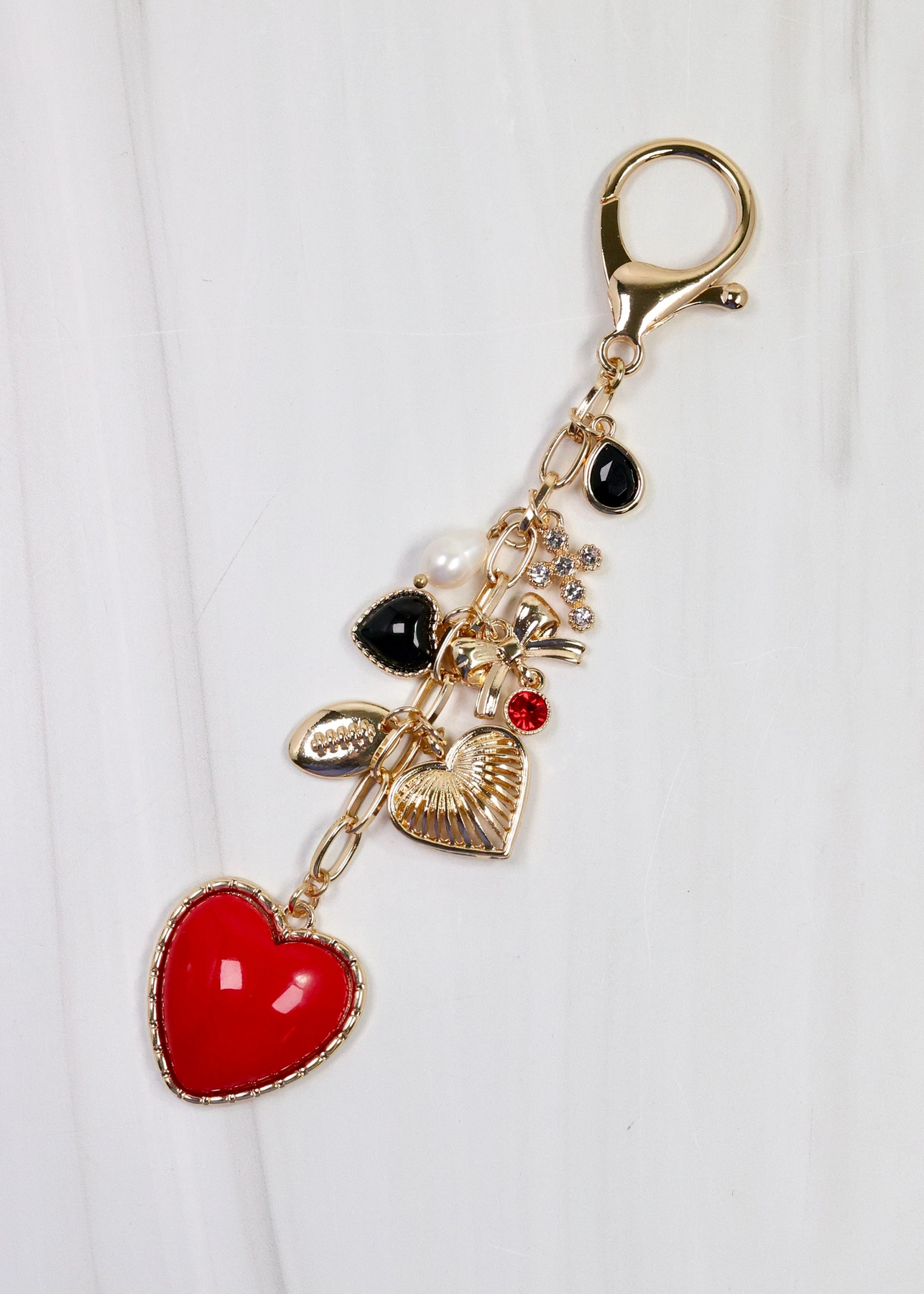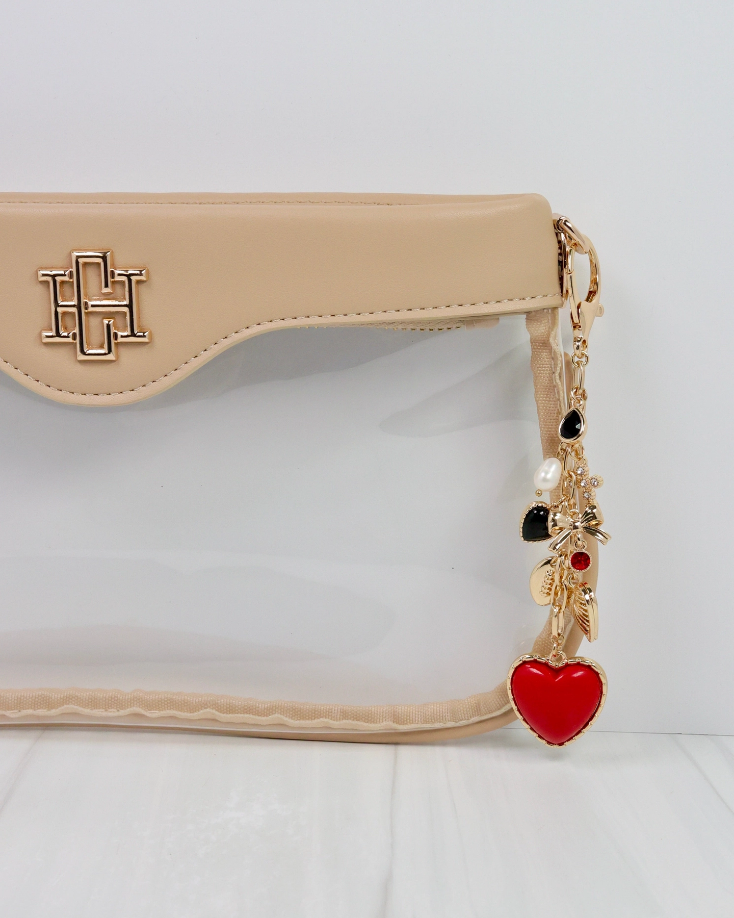 Add a stylish touch to your gameday look with the Sutton Bag Charm in red and black. This charming accessory features two hearts, a football, a cross, and a clover, making it a versatile piece to brighten your clear bag, use as a key chain, or pair with a scarf for a boot charm. Its playful design adds a fashionable pop of color and personality wherever you choose to wear it.