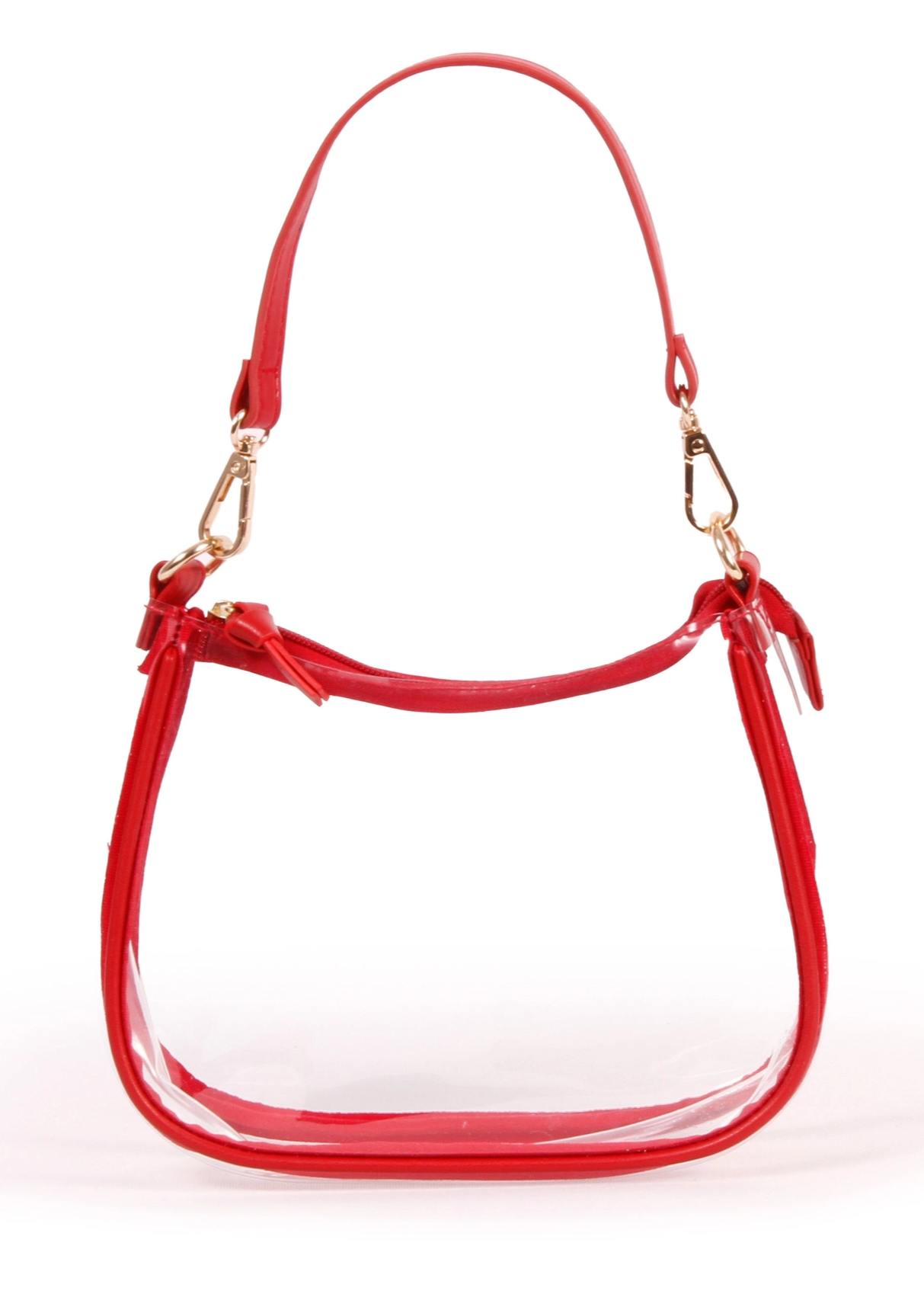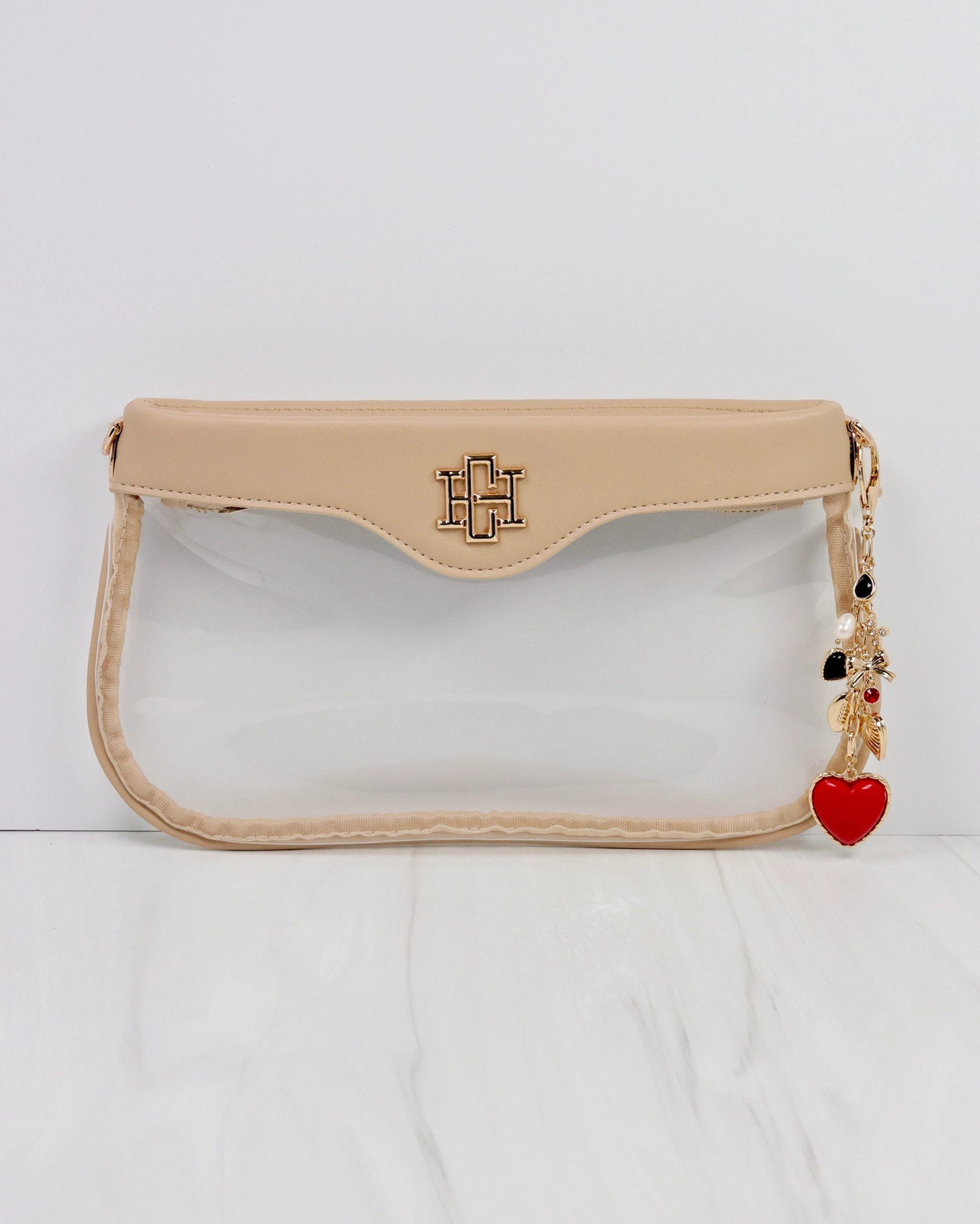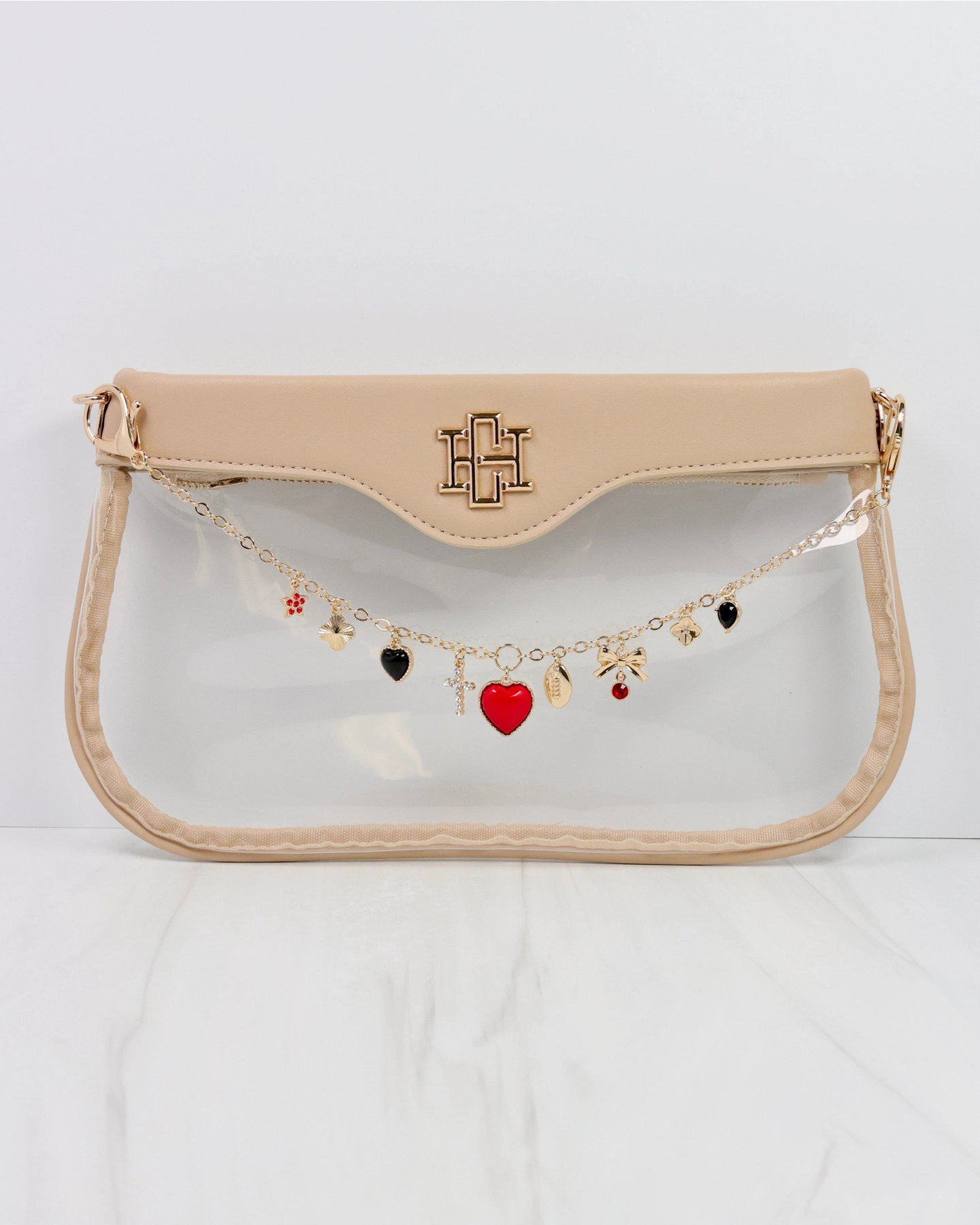 Add a stylish touch to your gameday look with the Sutton Bag Charm in red and black. This charming accessory features two hearts, a football, a cross, and a clover, making it a versatile piece to brighten your clear bag, use as a key chain, or pair with a scarf for a boot charm. Its playful design adds a fashionable pop of color and personality wherever you choose to wear it.