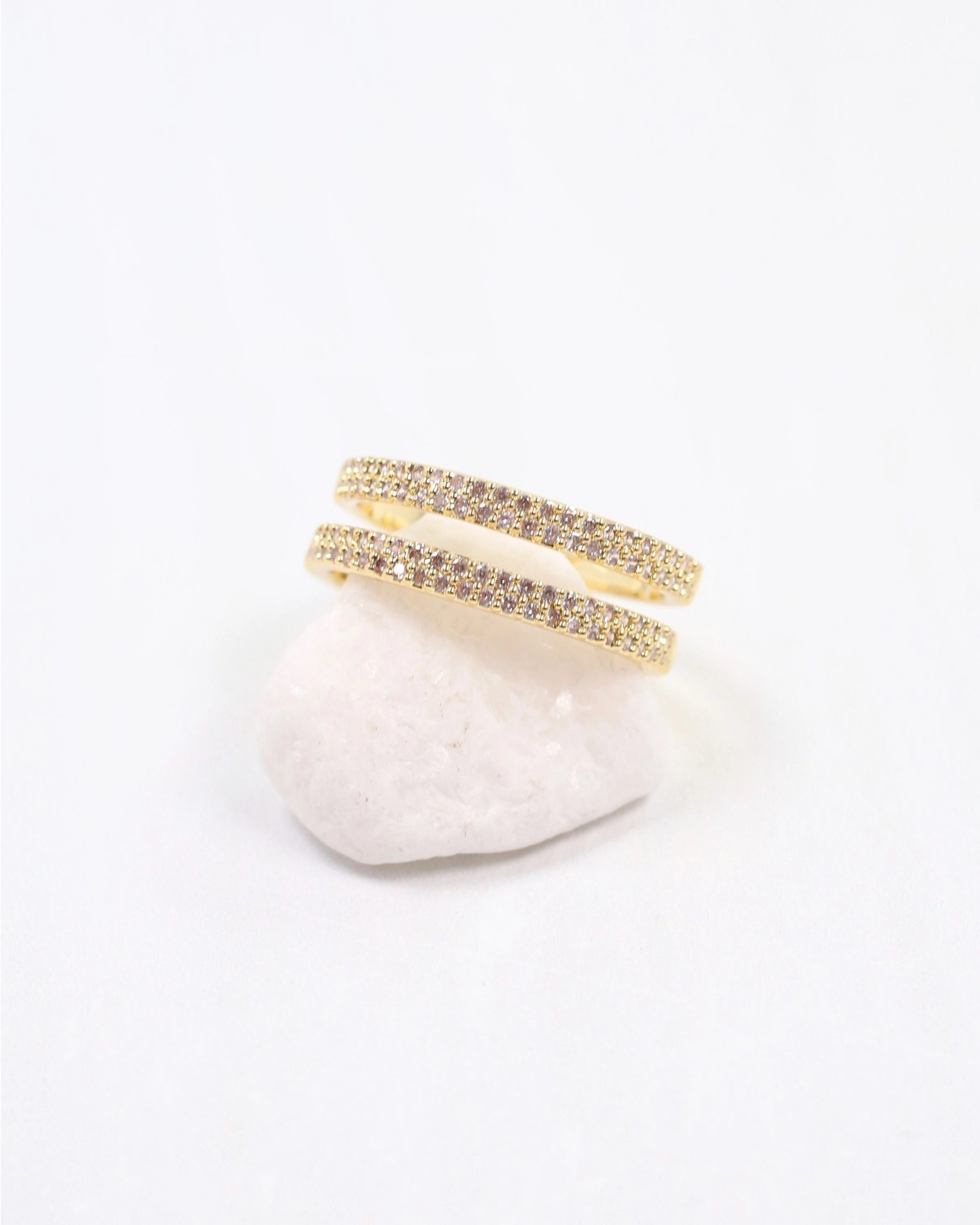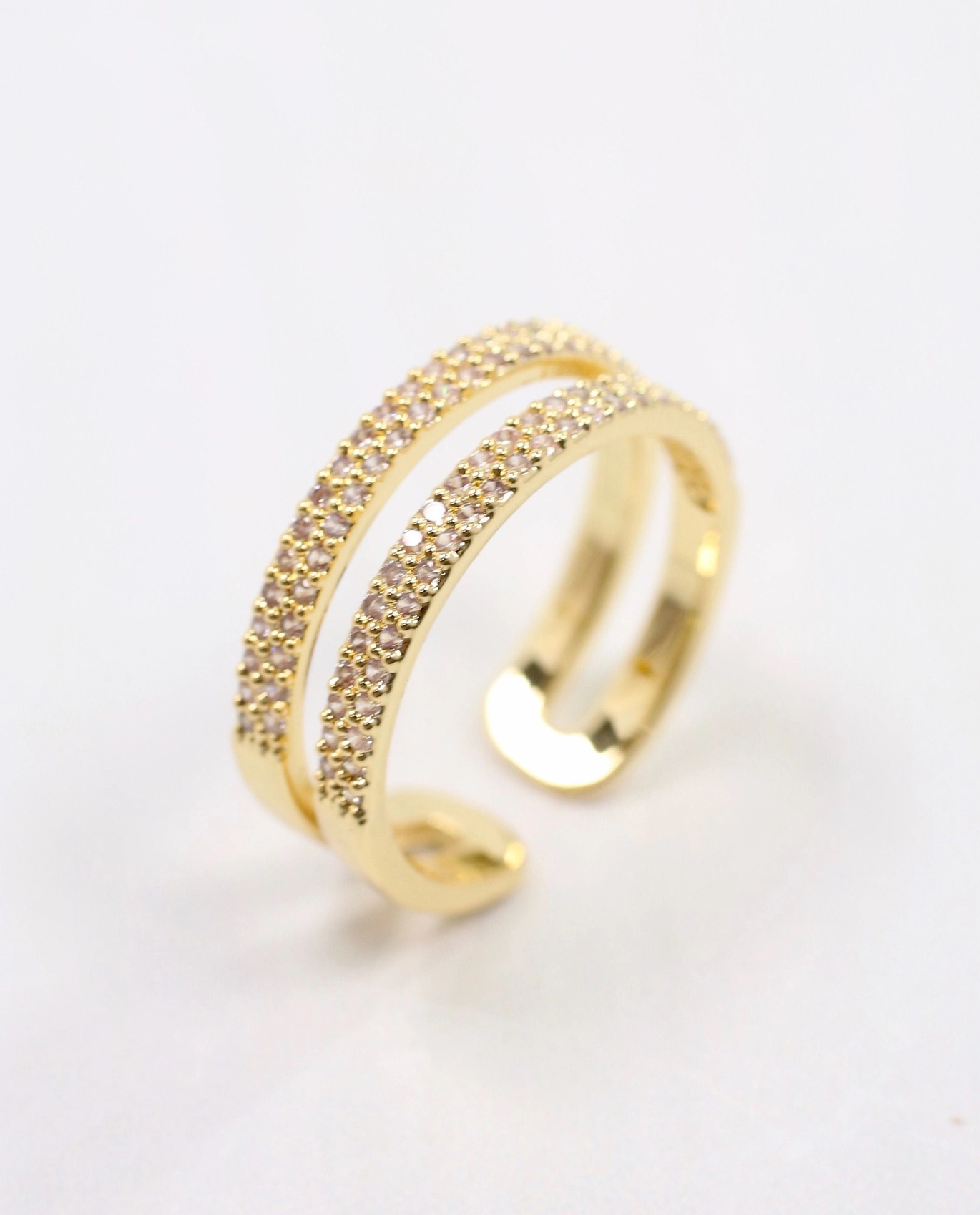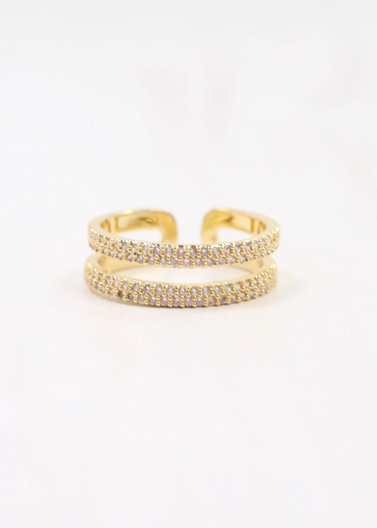 Elevate your style with the Wrightsville Ring in Gold, featuring a double-layer open pave band that adds refined sparkle. Crafted from gold-dipped brass, this adjustable ring offers both elegance and versatility, making it a timeless addition to any jewelry collection.