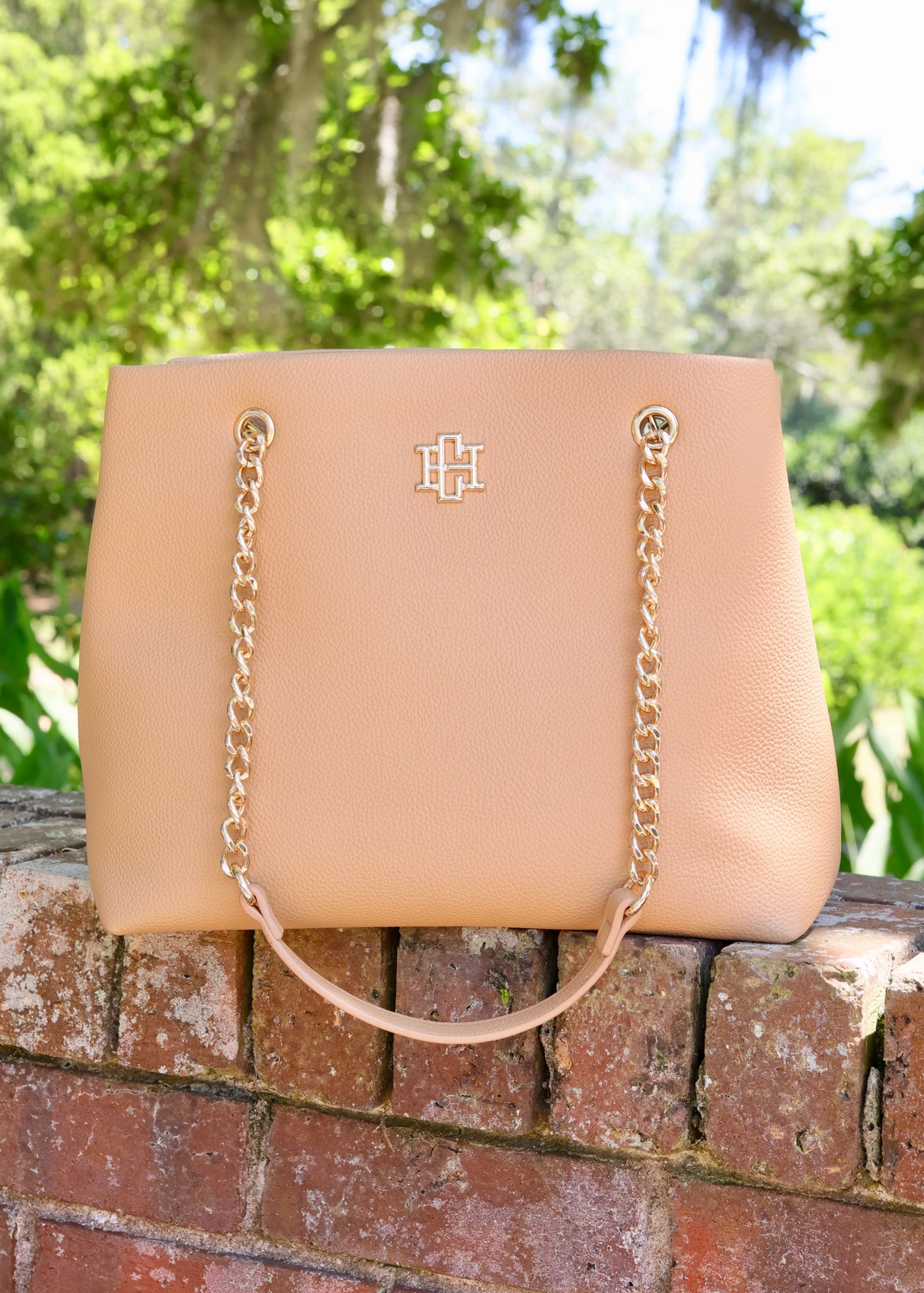 This chic tote is made with a soft, pebbled vegan leather material. It features the Caroline Hill logo centered on one side and two chain handles with matching pebbled material. This tote has a top magnetic closure that leads to the organized interior. It features a center zippered section and two large open sections as well. You will also find one zippered pocket and one large open pocket inside. An adjustable crossbody strap is included that is easily removable.