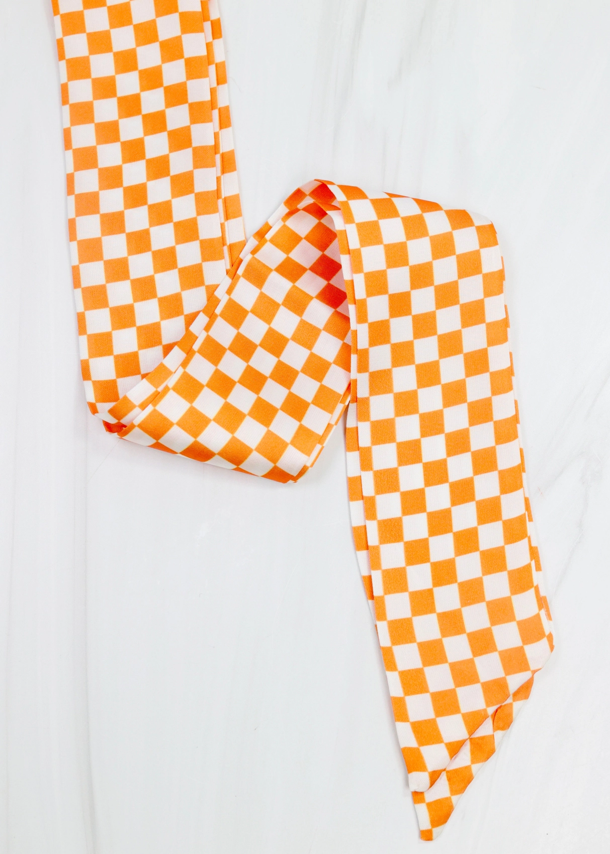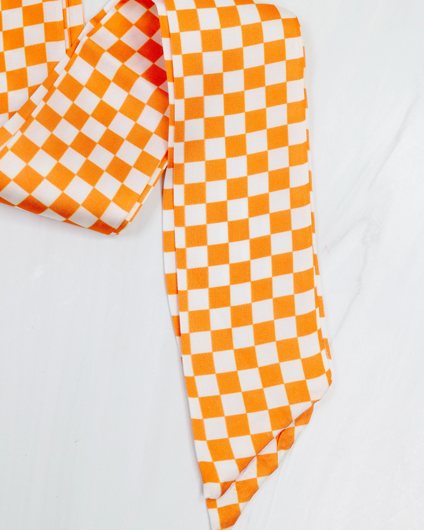 Add a stylish touch to any outfit with the Serafina Scarf in a classic orange check pattern. Its smooth satin-like texture makes it perfect for tying around your neck, wrist, bag, or even your cowgirl boots, adding a playful and fashionable flair wherever you wear it.