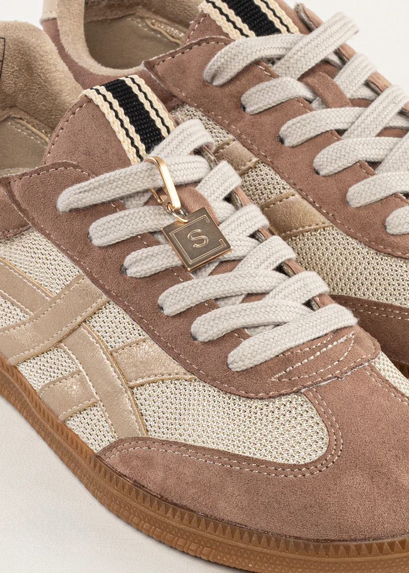 Sasha the sneaker that nails effortless cool. Crafted with faux suede panels and breathable mesh, the Taupe Suede colorway brings an easy neutral tone that matches with everything. A retro-inspired gum sole, classic lace-up design, and signature SHUSHOP gold keychain charm add the finishing touches. Comfortable enough for everyday wear, stylish enough to stand out.