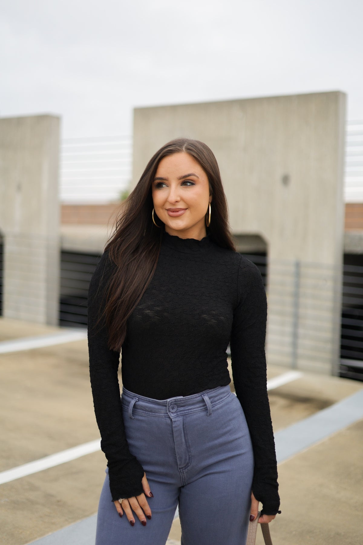 Elevate your wardrobe with the Easy Going Fitted Lace Top in classic black. Perfect for layering, this delicate lace top adds a touch of elegance and texture to any outfit. Its fitted design hugs your silhouette, making it an ideal base piece under jackets, cardigans, or dresses. Whether dressing up for an evening out or adding sophistication to your everyday look, this versatile lace top blends comfort with timeless style effortlessly.