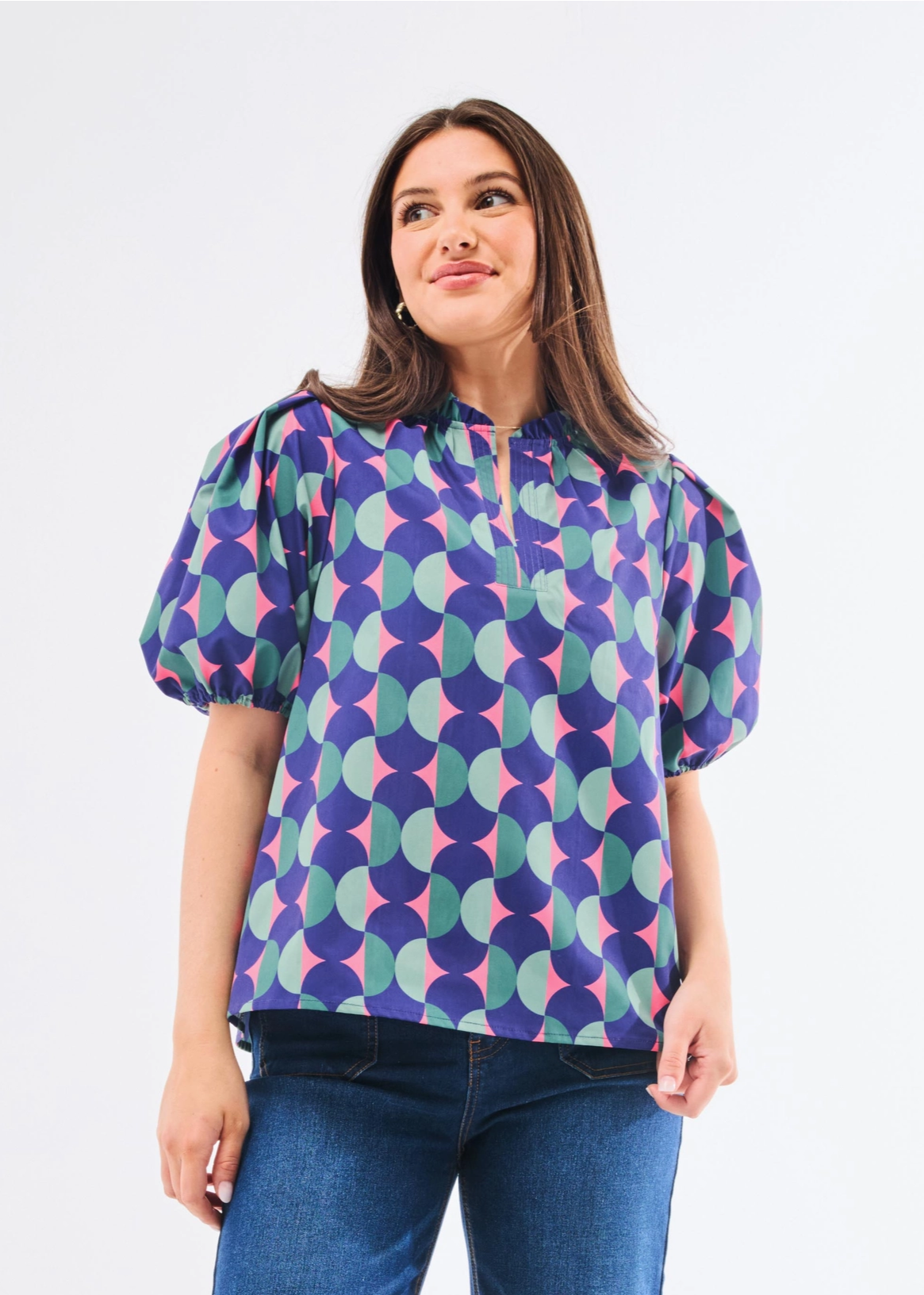 The Aria Top exudes a fresh, feminine charm with its delicate ruffle detailing at the neckline, adding a touch of elegance and flair. The three-quarter puff sleeves bring a sense of volume and sophistication, while the split neckline enhances its relaxed yet polished look.