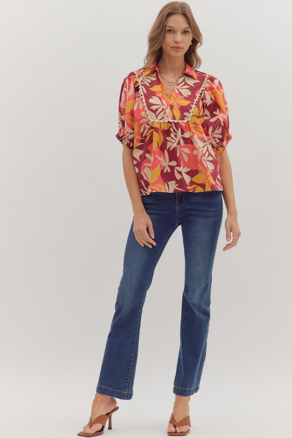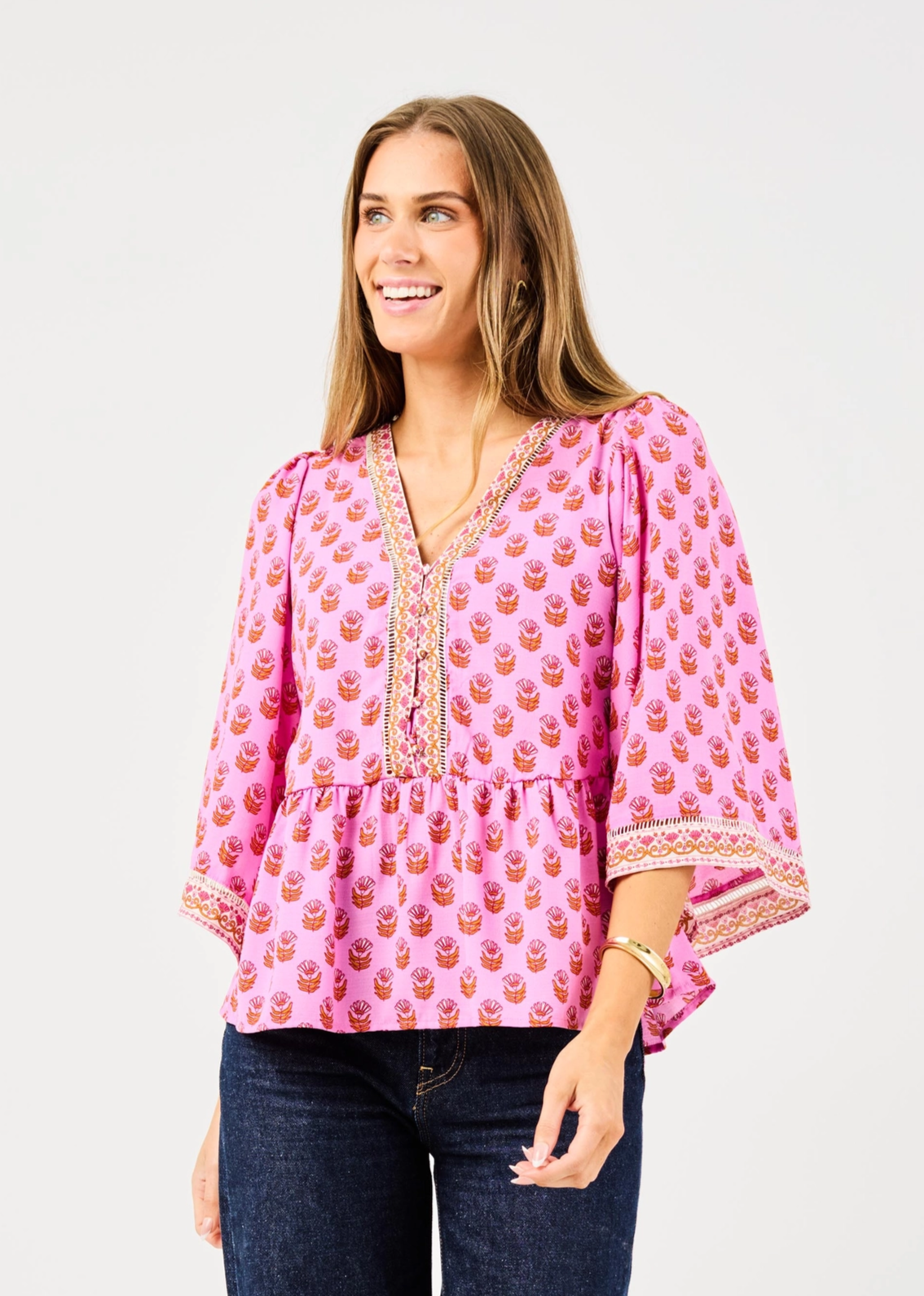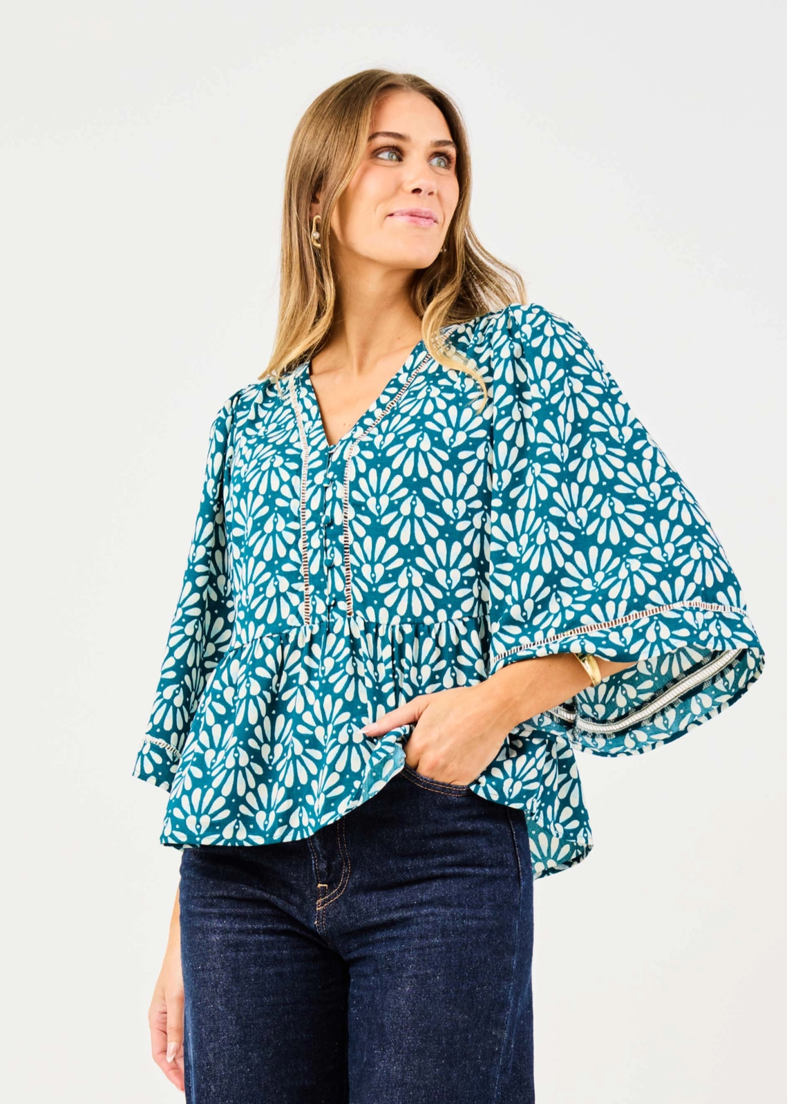 The Monroe Top combines chic details with a relaxed fit for effortless style. Featuring a flattering v-neckline and bell sleeves, it adds a touch of drama to your everyday look. The ladder trim at the placket and sleeves gives it a unique, stylish edge, making this top perfect for both casual and dressed-up moments.