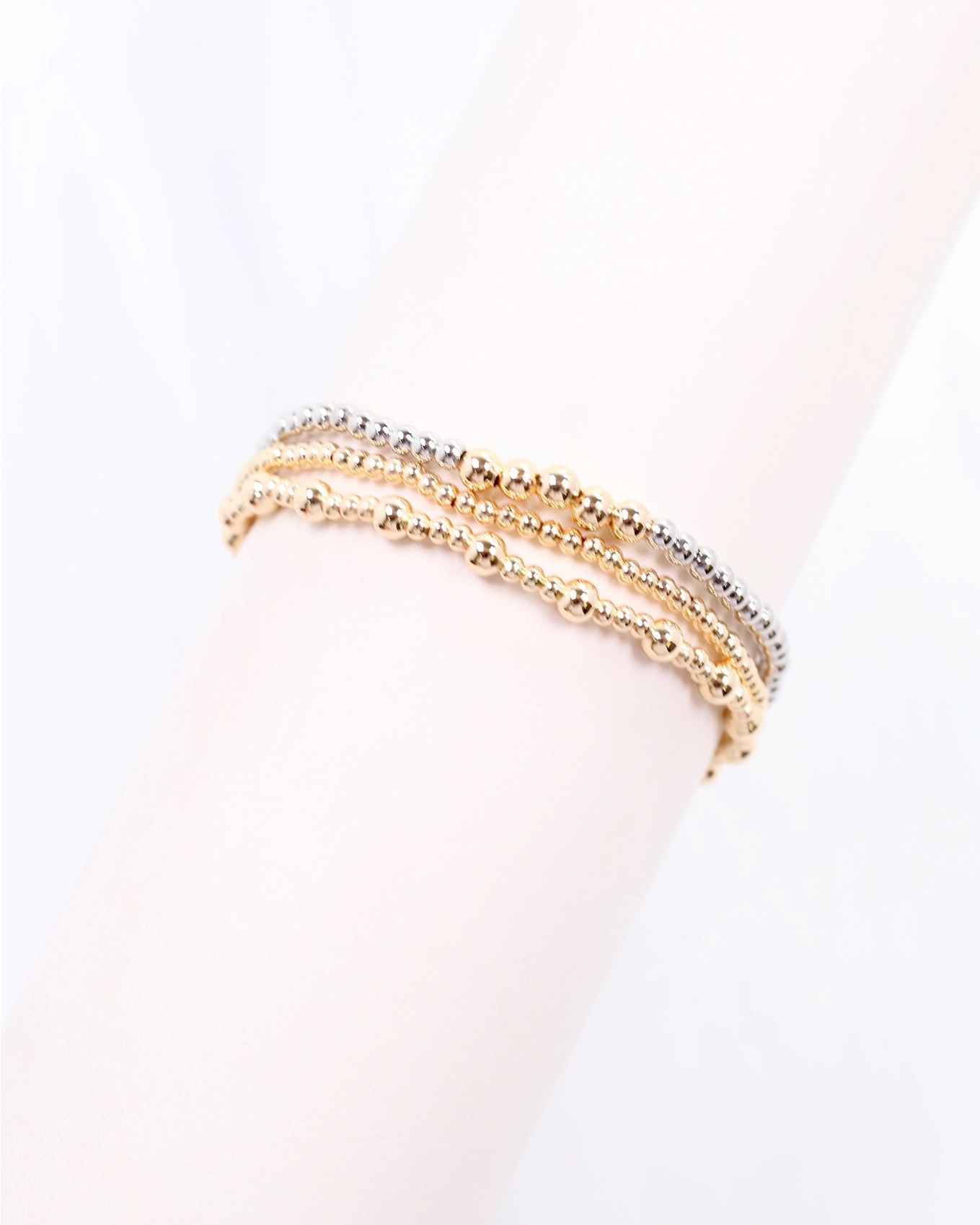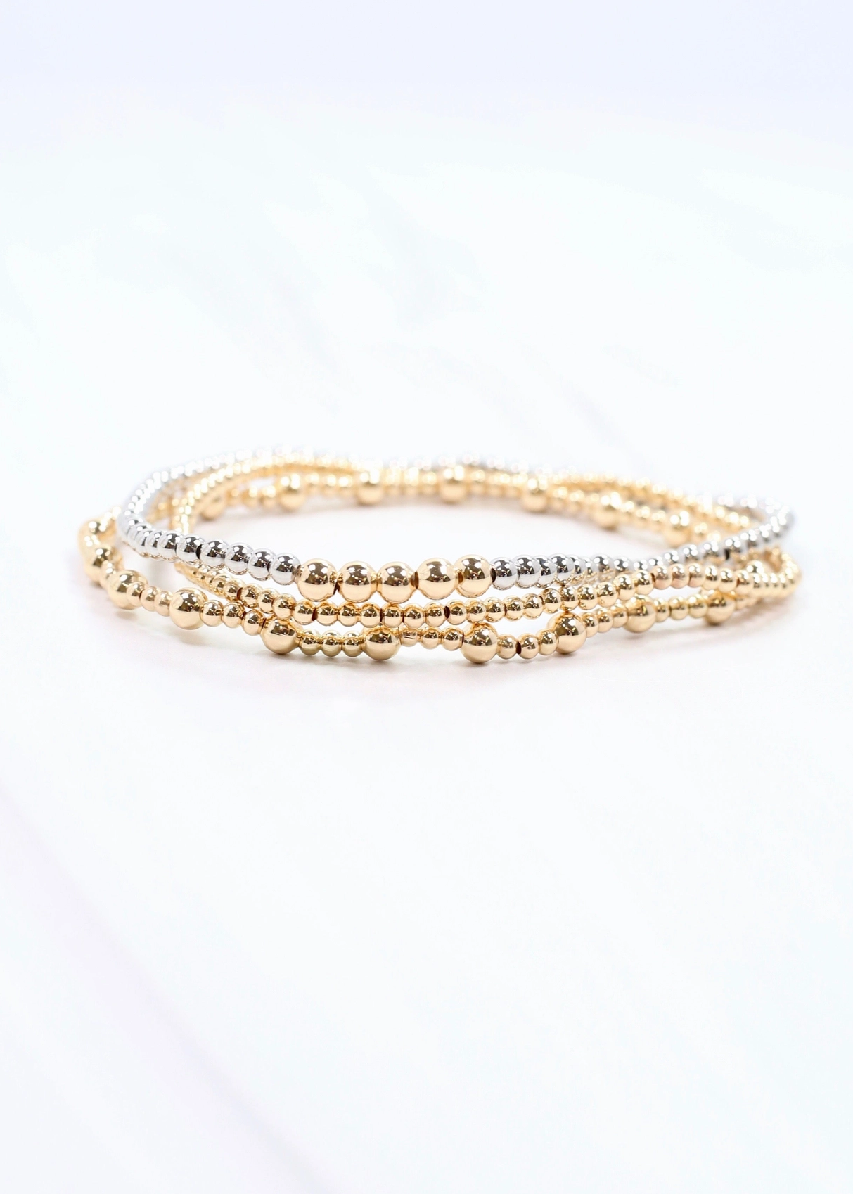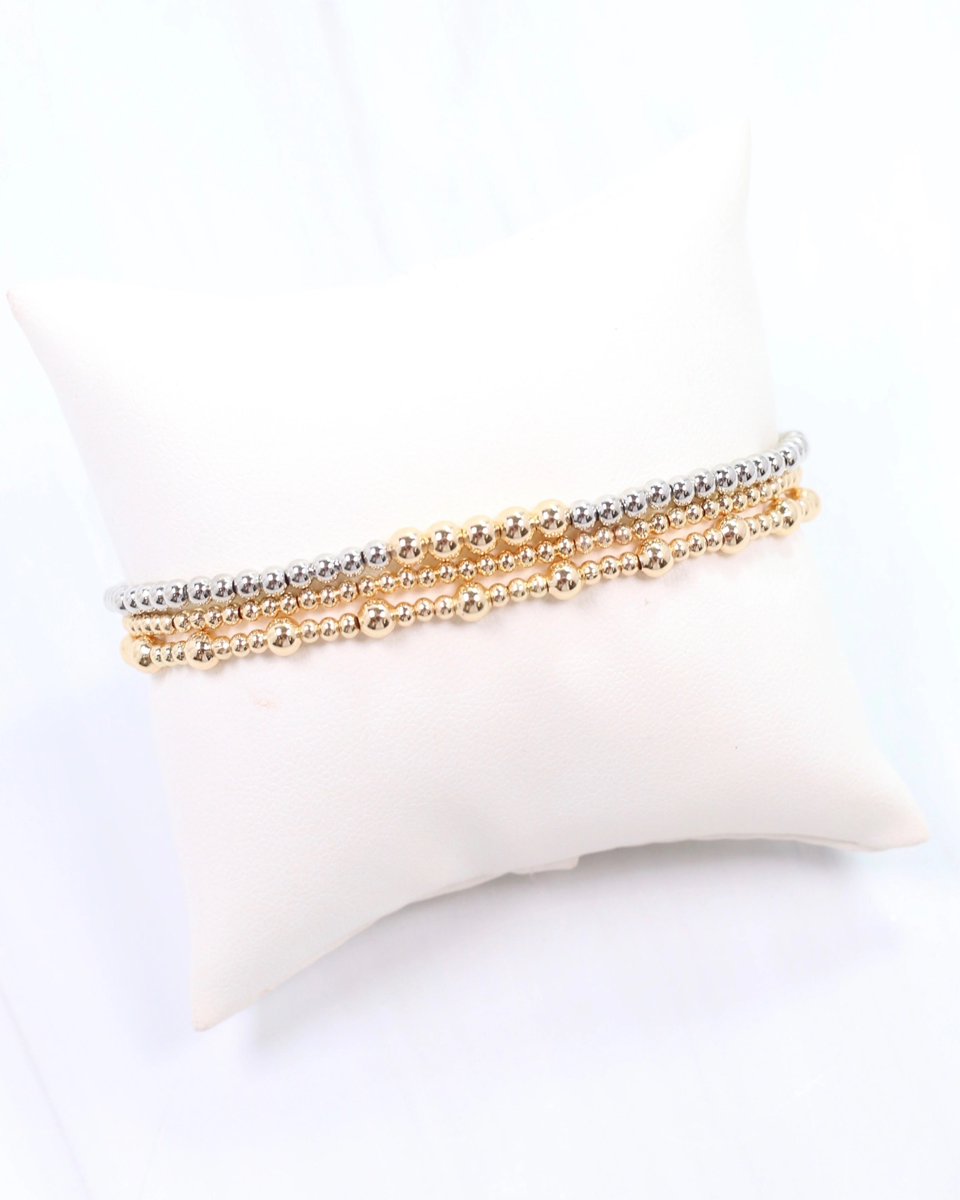 Add a touch of sparkle with the Leah Bracelet Set! This playful trio mixes gold and silver beads for a fun, versatile look that brightens any outfit. Stack them up or wear solo to shine with effortless style every day.