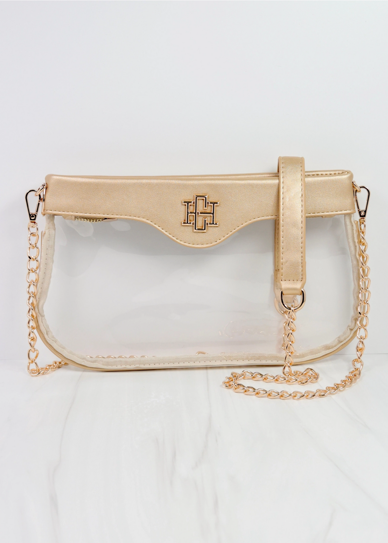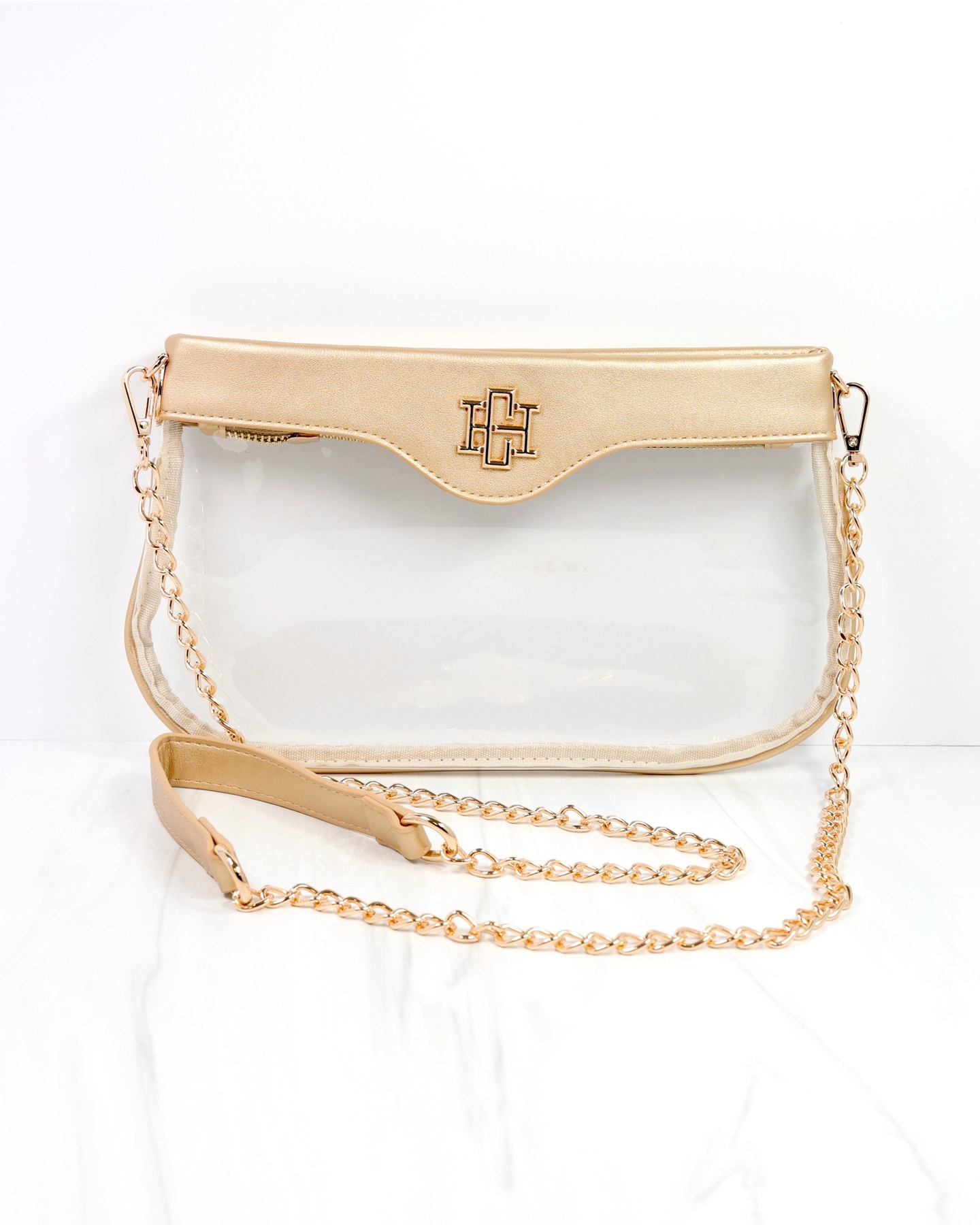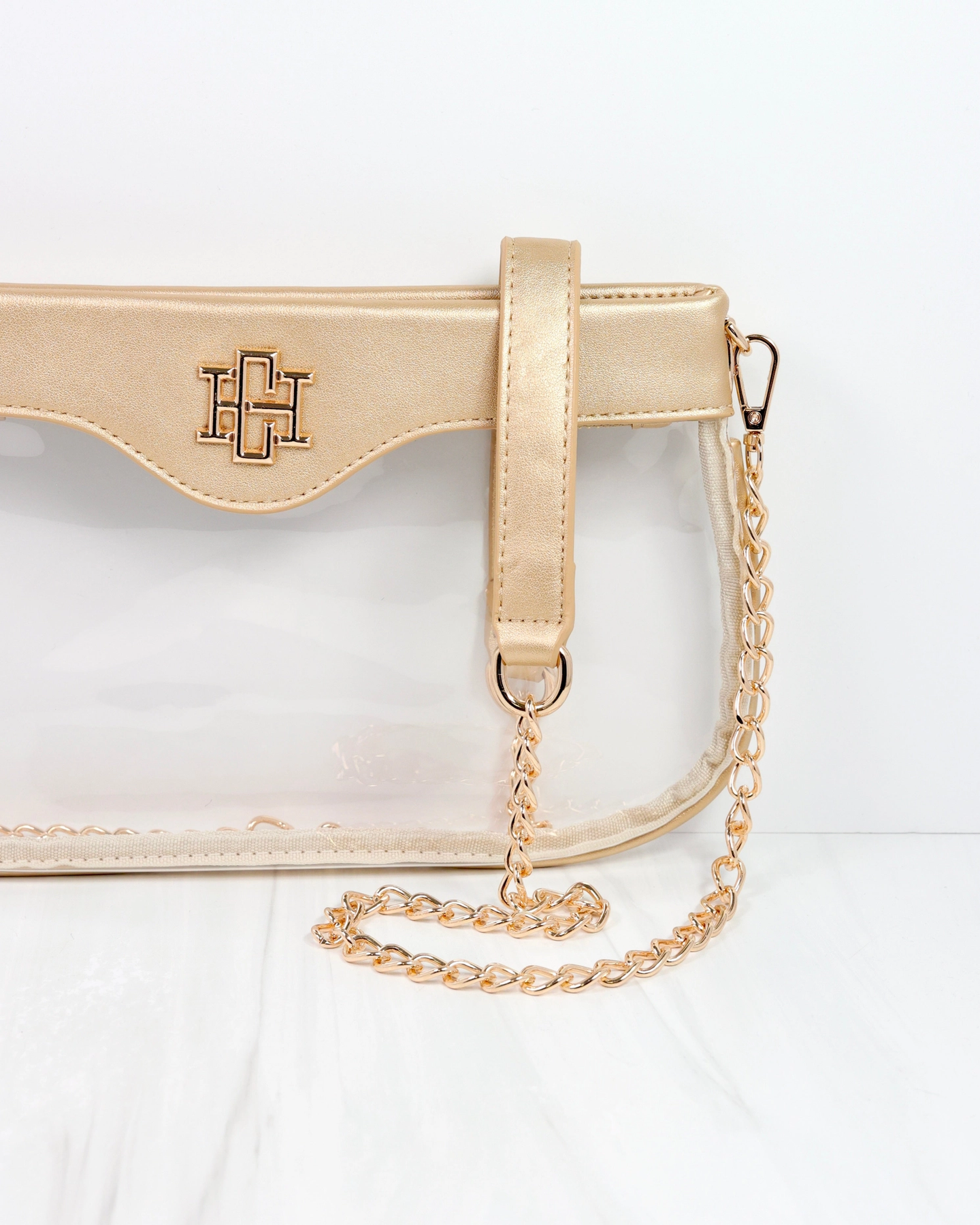The Madi Clear Crossbody in Gold is the perfect accessory for game day, combining style and practicality. Its transparent design meets stadium requirements, while the chic chain strap adds a fashionable touch. Easily pair it with our purse chains or charms and keep essentials close at hand.