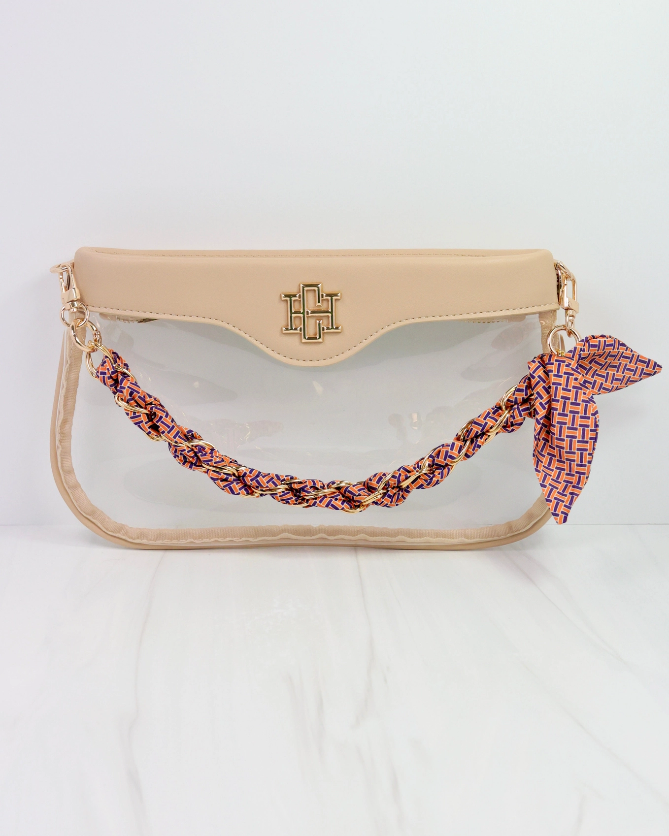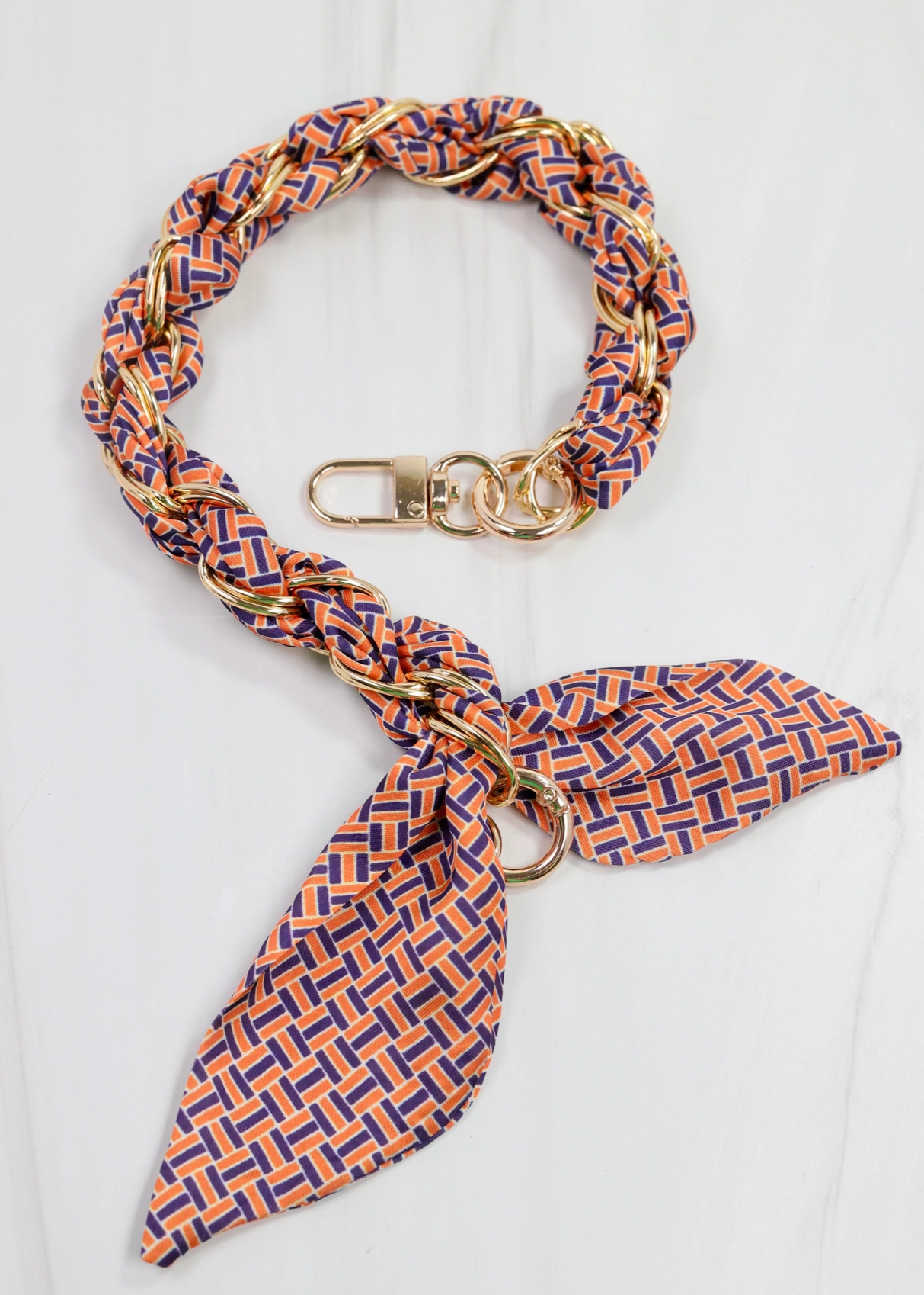 Elevate your accessory game with the Serafina Scarf Purse Chain in a beautiful Navy & Orange print. Featuring a chic gold link chain intertwined with a stylish printed scarf, this piece effortlessly combines school spirit with sophisticated fashion. Perfect for adding a refined yet spirited touch to your favorite handbag.