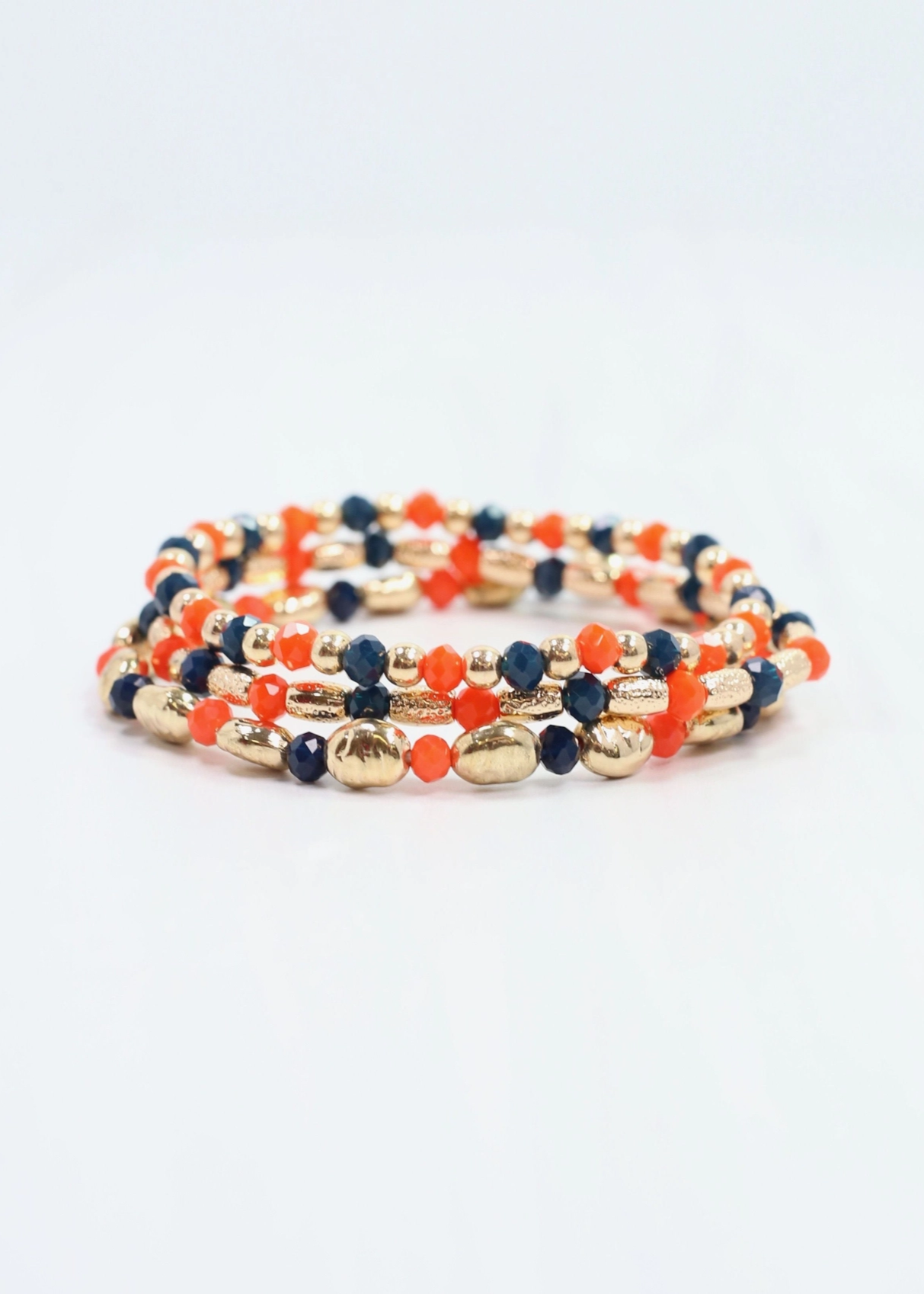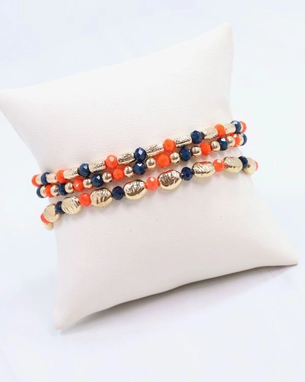 Show your team spirit with this Orange and Navy Beaded Bracelet Set! Three uniquely patterned stretch bracelets that stack perfectly together or mix with your other gold accessories. Perfect for game day or any day you want to flaunt your team colors. Stack 'em up and cheer on your favorite squad in style. Go team go!